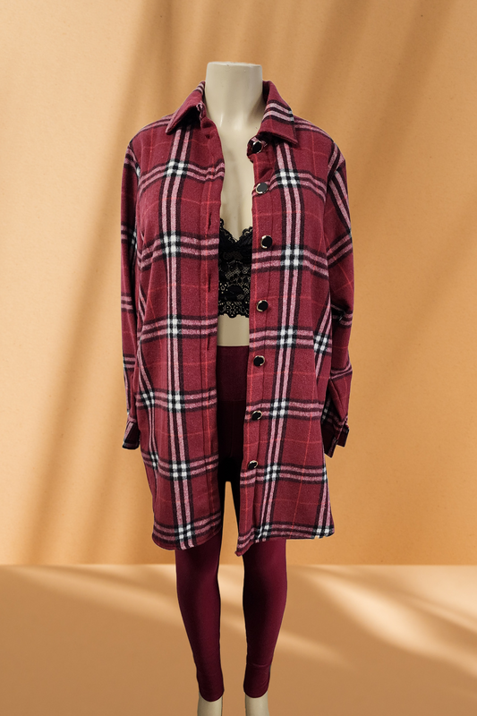 Women's Long Red Plaid/Flannel Jacket with Fleece